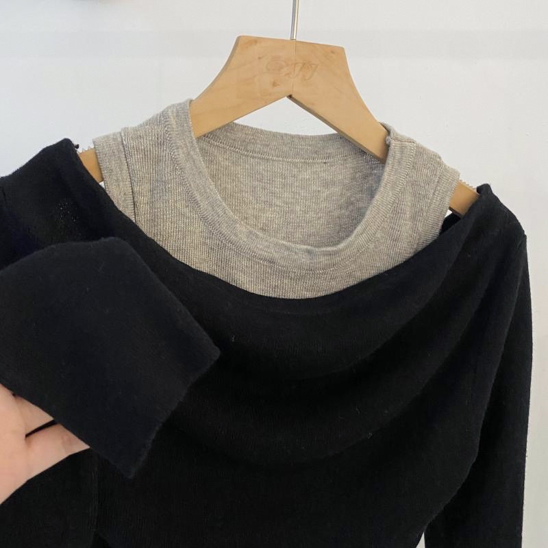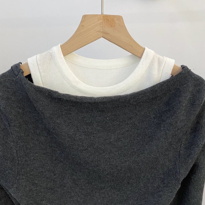 撞色假两件设计 一字肩休闲针织衫|Off Shoulder Contrast Knit Top