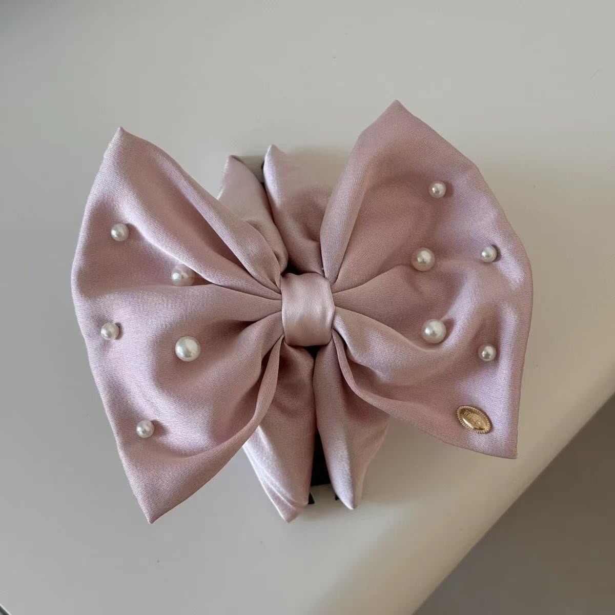 缎面材质自带柔光质感,搭配立体珍珠点缀,呈现高级又甜美的气质。 大蝴蝶结造型修饰脸型、提升整体精致度,是韩系名媛风穿搭必备的亮点单品。 Soft satin texture paired with pearl accents creates a chic and elegant look. The oversized bow adds a flattering, feminine touch that elevates any everyday or dressy outfit.