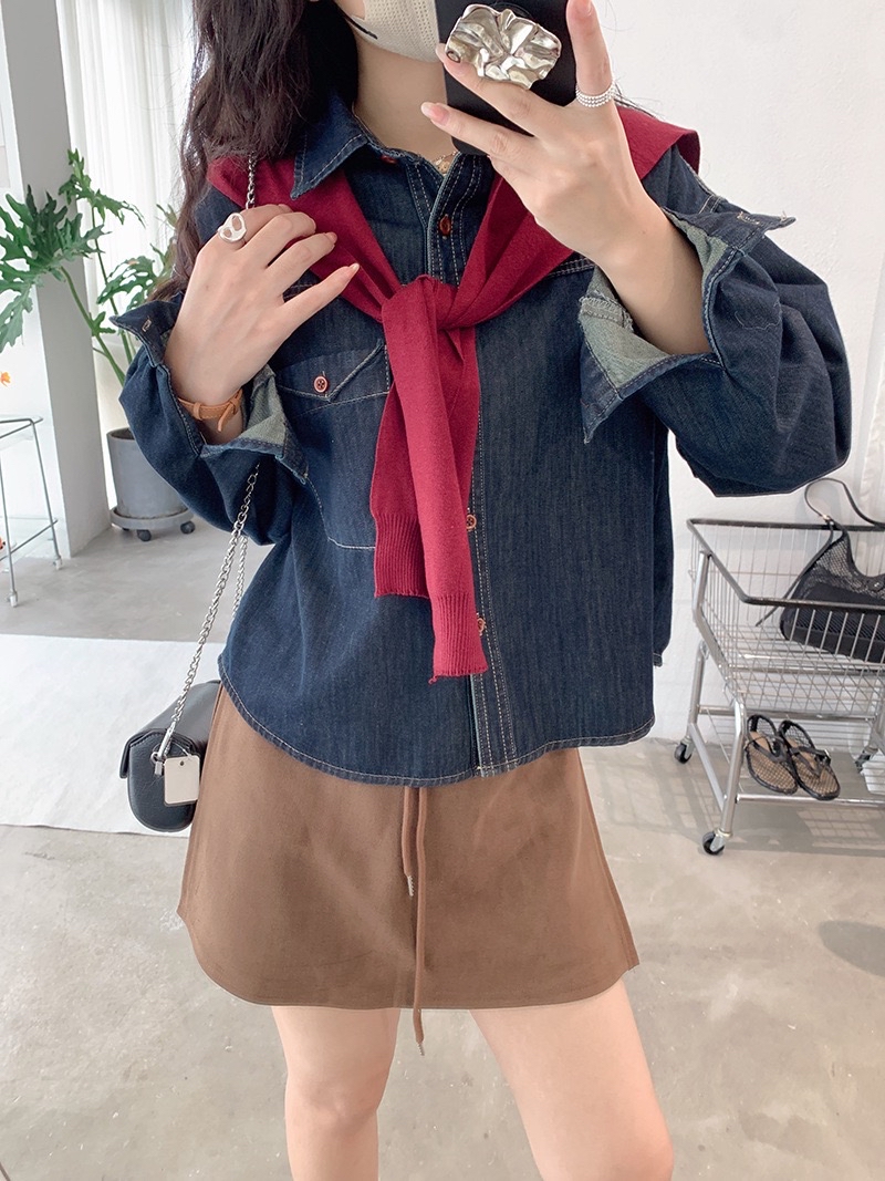 经典牛仔外套加酒红针织披肩,温暖又有层次感~随意搭T恤或连衣裙都好看! 📏 尺寸参考|Size Info 肩宽 51cm|胸围 110cm|衣长 52cm (手工测量,误差 ±1-2cm 为正常范围) Classic denim jacket paired with wine red knit shawl. Cozy and stylish, easy to match with tees or dresses.